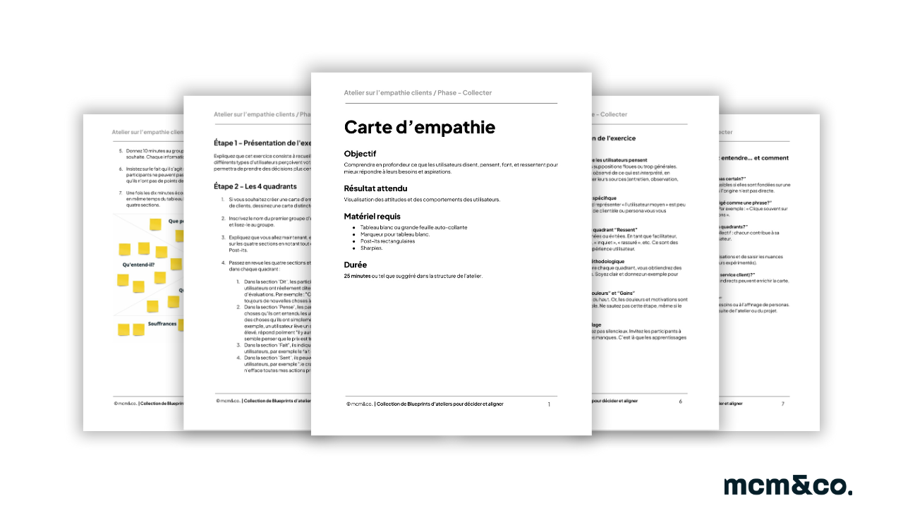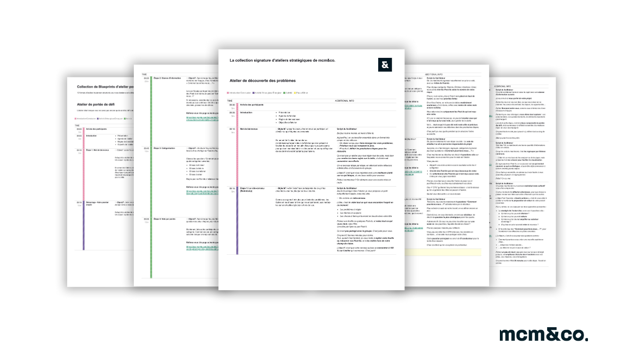 C’est une collection de 12 blueprints d’ateliers stratégiques, chacun pensé pour répondre à une situation précise vécue sur le terrain :clarifier un enjeu flou, aligner une équipe, lancer un projet, décider à plusieurs sans tourner en rond.