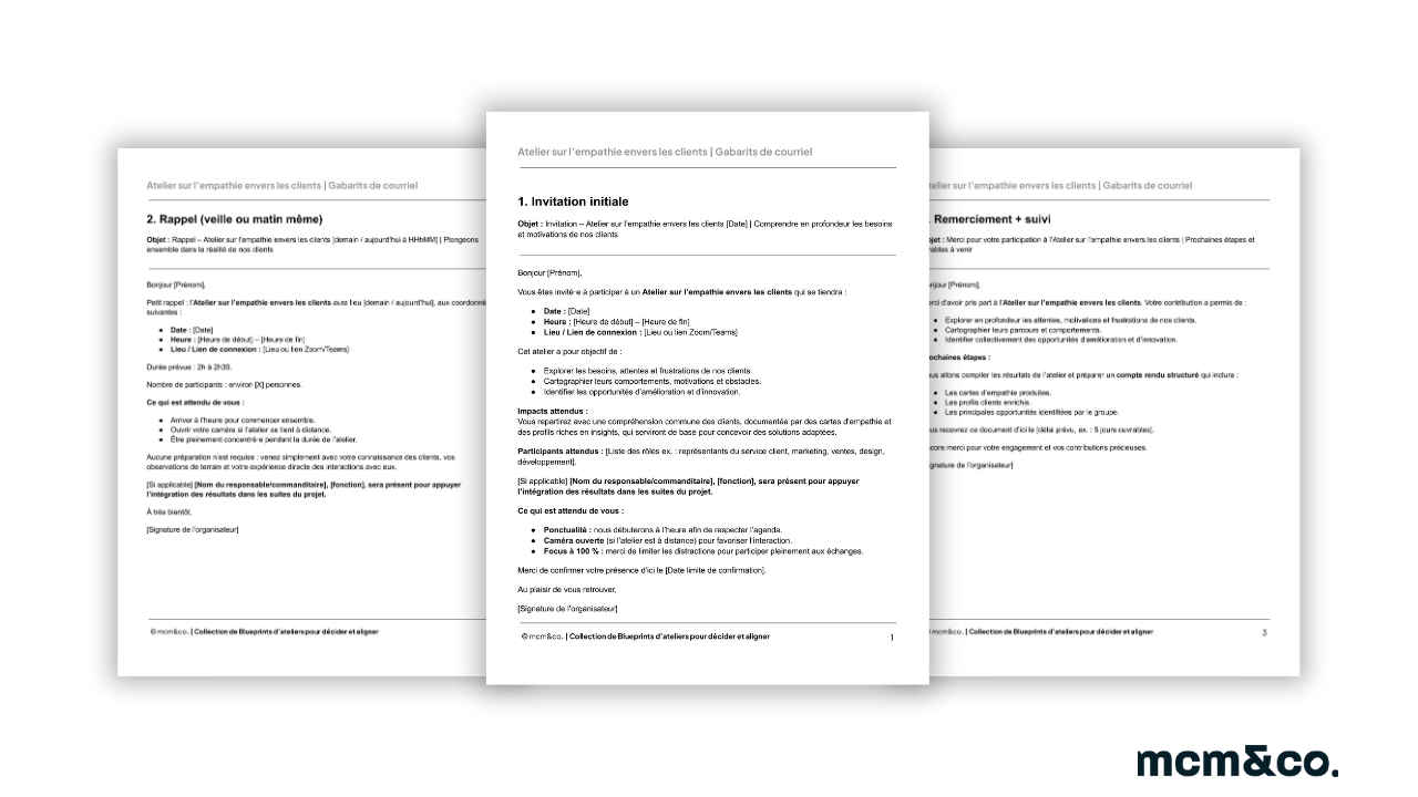 Des modèles prêts à l’emploi pour inviter les bons participants, clarifier les attentes et assurer le suivi. Chaque gabarit inclut un volet « Ce qui est attendu de vous » (caméra ouverte si virtuelle, ponctualité, focus).