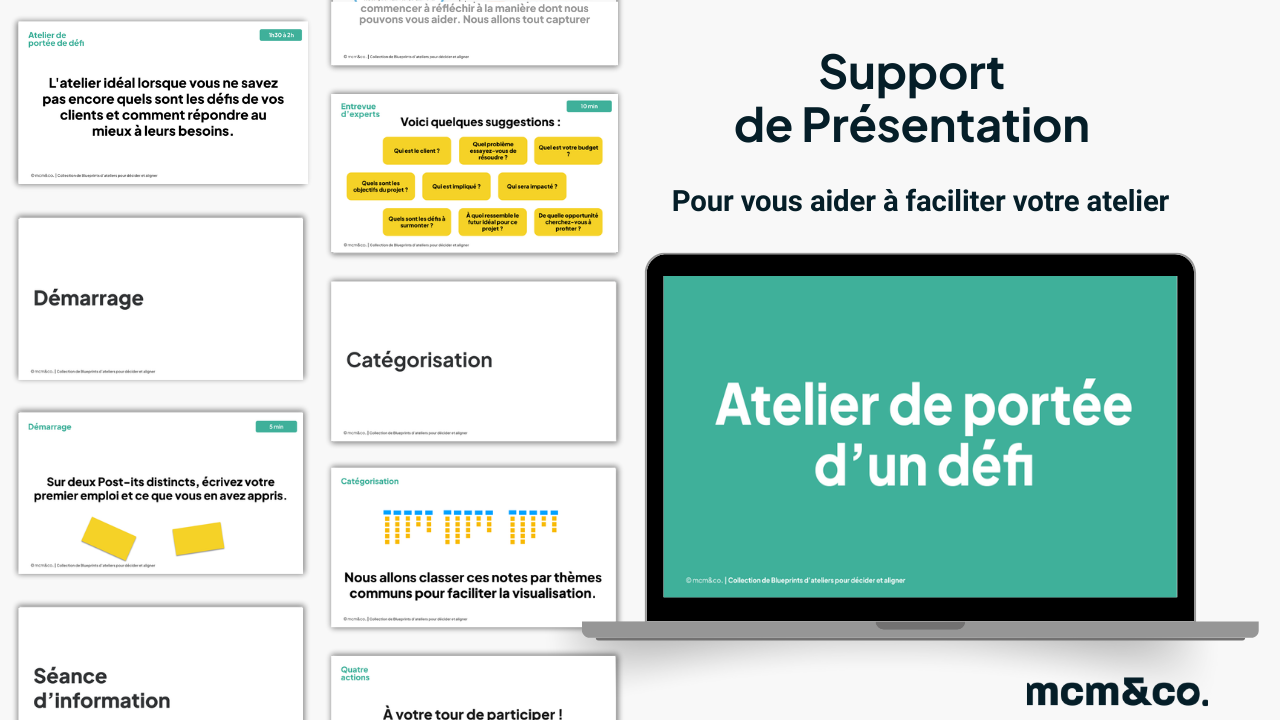 Une collection exclusive de 12 ateliers clés en main, en français, couvrant 5 thématiques pour répondre à chaque besoin : clarifier, décider, planifier, s’aligner et inspirer vos équipes.