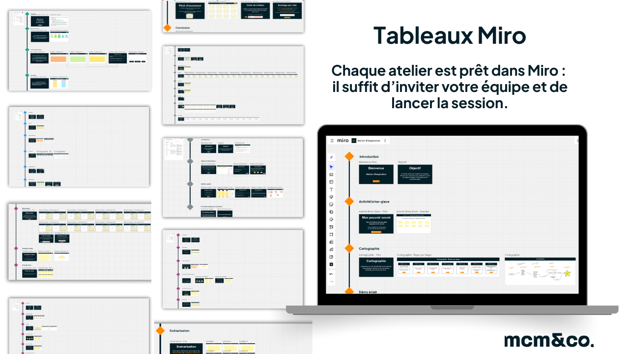 Chaque atelier est déjà structuré dans Miro. Vous n’avez qu’à inviter votre équipe et lancer la session.